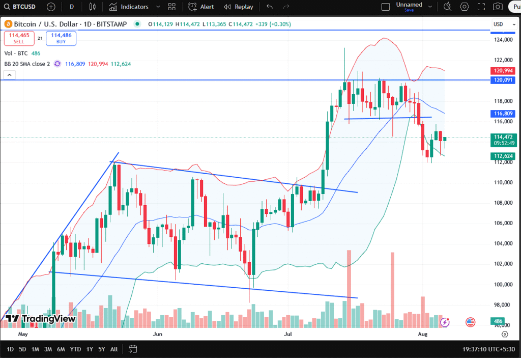 With the Bollinger Bands compressed, price action near resistance, and global markets in flux, Bitcoin’s next 7–10 days could shape the tone for the rest of Q3 2025.