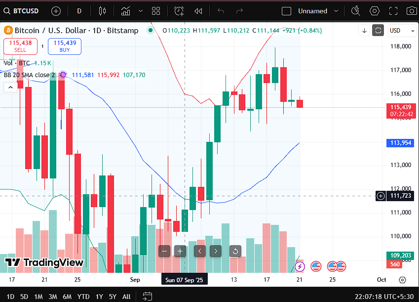 Bitcoin’s price chart for September highlights an intense battle between buyers and sellers. After touching a recent high near $117,000, the cryptocurrency pulled back slightly but has managed to stay above the $115,000 support level for now. This zone has emerged as a crucial psychological level for traders.