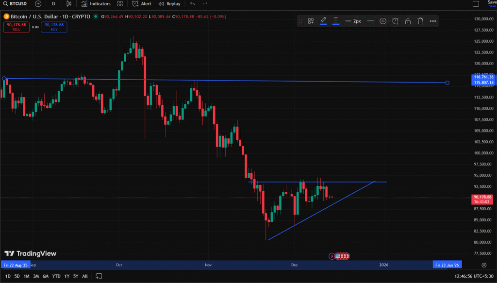 The chart also shows a rising trendline from recent lows, forming a triangular structure. This pattern often represents indecision. Neither bulls nor bears have full control. Instead, the market is waiting for a trigger — such as macroeconomic news, institutional activity, or regulatory clarity.