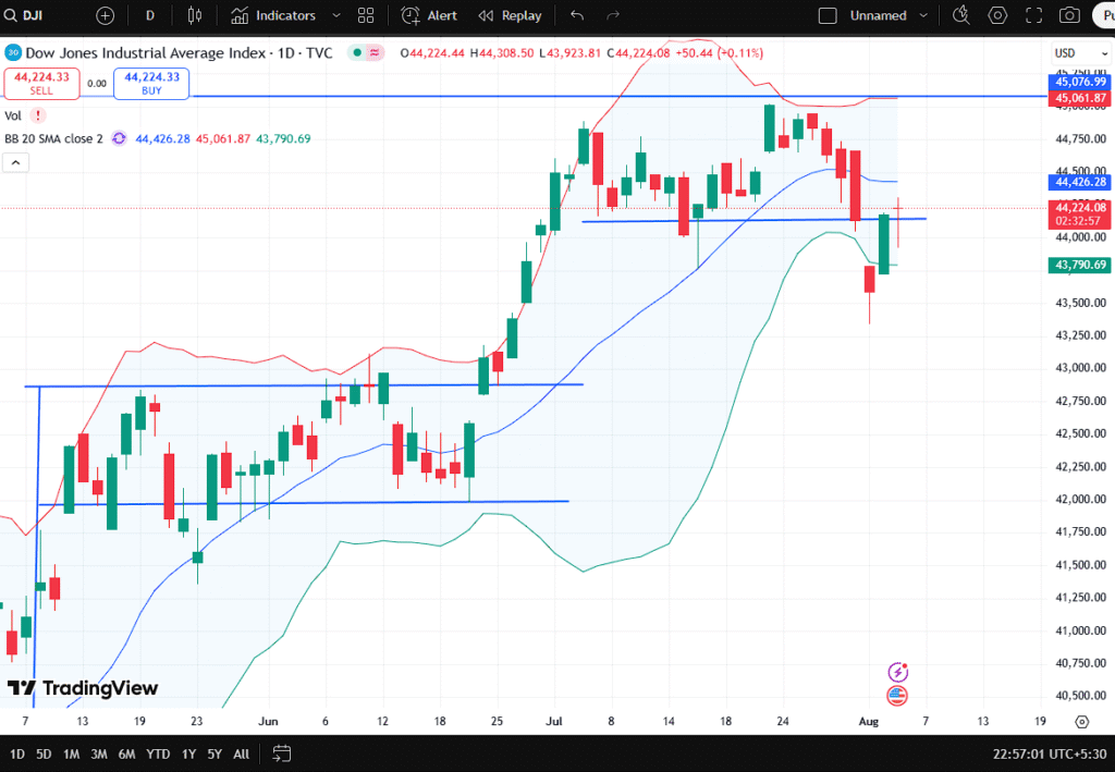 “Dow Jones daily chart shows bounce from lower Bollinger Band support with current resistance near 44,426.”