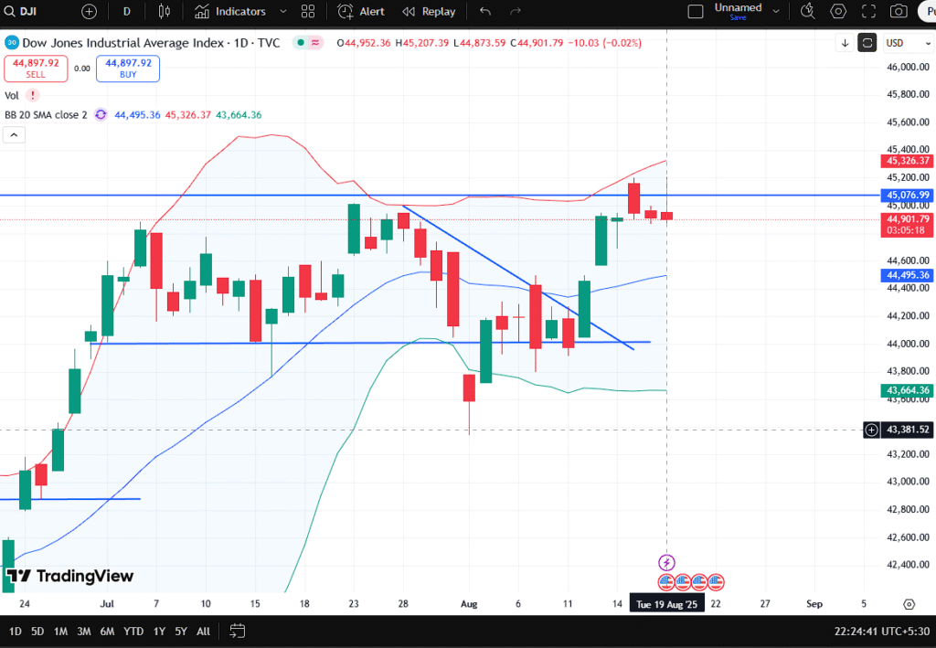 The Dow Jones Industrial Average (DJIA) is hovering near a crucial resistance level of 45,000, sparking debates among traders and investors about whether the index will break higher or face a pullback. Despite recent bullish momentum, market sentiment remains cautious as global economic uncertainties, corporate earnings, and Federal Reserve policies continue to weigh on investor decisions. With technical indicators flashing mixed signals, the Dow’s next move could set the tone for U.S. equities heading into the final weeks of August 2025.