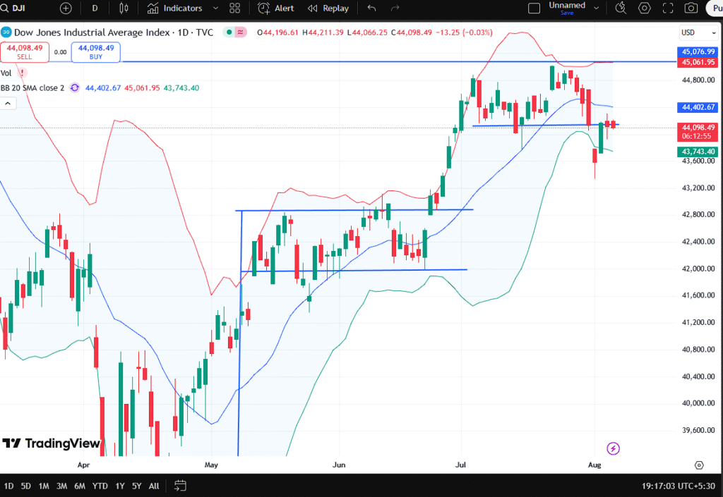The Dow Jones Industrial Average (DJIA) continues to trade under pressure, closing at 44,098.49, down 13.25 points (-0.03%), and testing the crucial 20-day SMA/Bollinger Band midpoint at 44,402.67. The index recently experienced a breakdown from a short-term range and is now struggling to regain bullish momentum. As the global equity rally pauses, investors are closely watching whether the Dow will bounce from its current zone or roll over for a deeper correction.